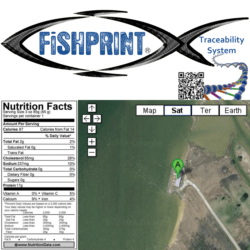 A first of it's kind traceability system that takes the diner from plate to fisherman! The FishPrint provides sustainable ratings, nutritional information, DNA test results, latin genus, map of catch or farm, waiter cards for food service with QR codes to create the path on any smartphone or computer.